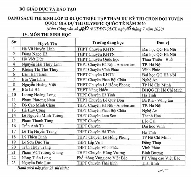 Theo báo Tiền Phong, năm nay Bộ GD&ĐT triệu tập học sinh dự kỳ thi chọn đội tuyển quốc gia dự thi Olympic quốc tế năm 2020 các môn gồm: Toán (28 thí sinh); Vật lý (31 thí sinh); Sinh học (23 thí sinh); Tin học (26 thí sinh); Hóa học (24 thí sinh). Theo đó, Bộ GD&ĐT đề nghị các sở GD&ĐT thực hiện miễn thi Kỳ thi tốt nghiệp THPT đối với các thí sinh có tên trong danh sách theo quy định của Quy chế thi tốt nghiệp THPT.