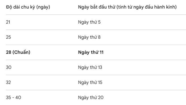Cách thực hiện: Bắt đầu thử từ vài ngày trước thời điểm dự kiến rụng trứng (thường là ngày thứ 11 của chu kỳ 28 ngày).