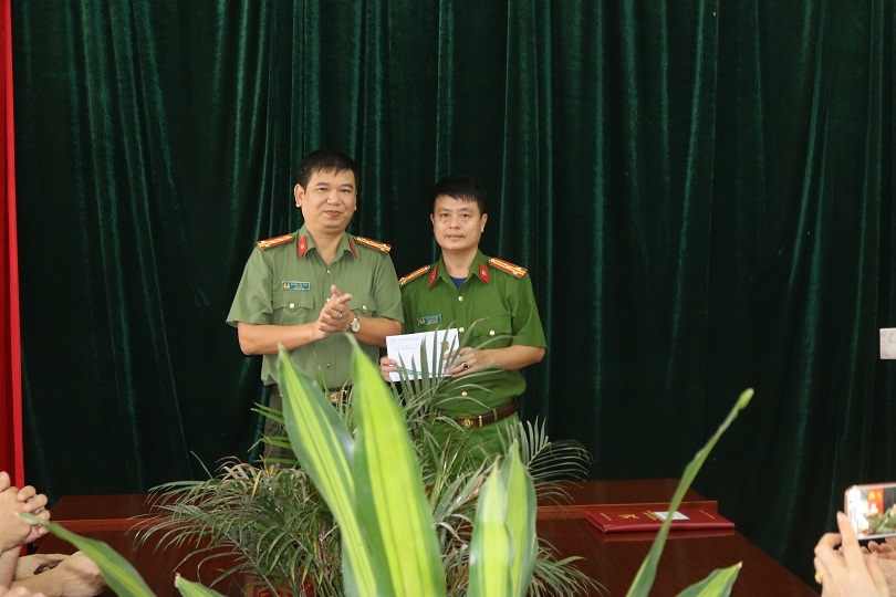 Đại tá Dương Văn Tính - Giám đốc Công an tỉnh biểu dương và thưởng nóng cho CBCS phòng CSHS