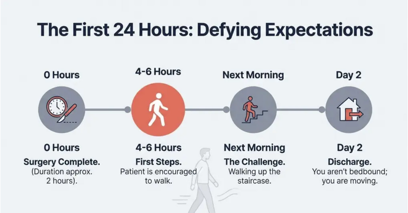 - 24 giờ đầu tiên: Bệnh nhân được khuyến khích tập đi lại chỉ sau 4-6 giờ sau mổ.
