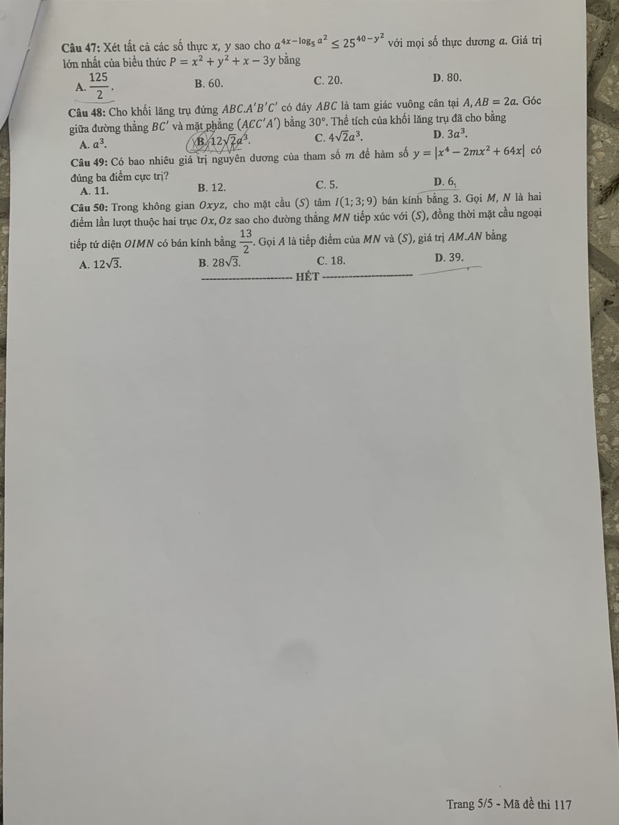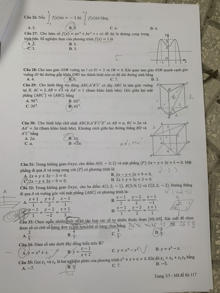 Gợi ý Đáp án đề thi môn Toán Học mã đề 117 kỳ thi tốt nghiệp THPT Quốc Gia năm học 2022-2023.