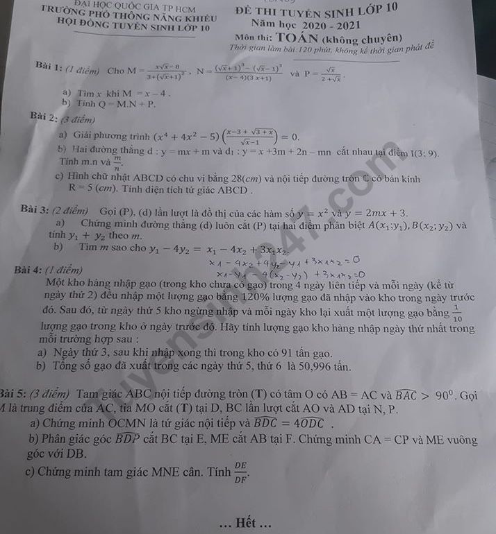 Đề thi vào lớp 10 môn Toán 2020 - PTNK