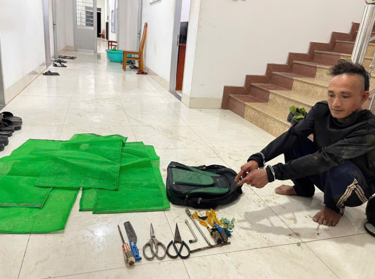 Lực lượng chức năng kiểm tra, thấy trong túi lưới có 4 con chồn, 1 con gà cùng một số dụng cụ gây án.