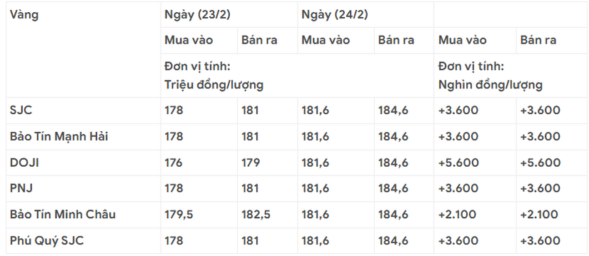 Cụ thể, vàng miếng thương hiệu SJC, PNJ, Bảo Tín Mạnh Hải, Phú Quý đều mua vào ở mức 181,6 triệu đồng/lượng; bán ra ở mức 184,6 triệu đồng/lượng - tăng 3,6 triệu đồng/lượng so với hôm qua.