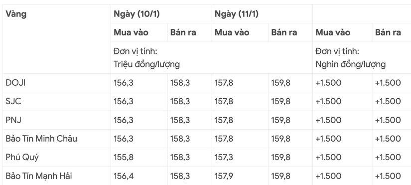 Giá vàng trong nước cập nhật sáng (11/1):