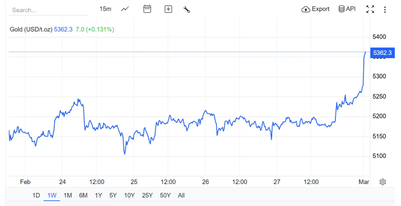 Giá vàng thế giới giao ngay trên thị trường châu Á lúc 6 giờ 30 phút sáng hôm nay ngày 2/3 (giờ Việt Nam) giao dịch ở quanh ngưỡng 5.362 USD/ounce, tăng mạnh 84 USD/ounce so với chốt phiên tuần vừa qua.