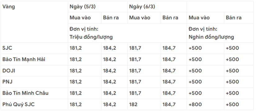 Các thương hiệu SJC, Bảo Tín Mạnh Hải, DOJI, PNJ, Bảo Tín Minh Châu đồng loạt niêm yết giá vàng miếng ở mức 181,7 - 184,7 triệu đồng/lượng mua vào - bán ra, tăng 500 nghìn đồng/lượng ở cả hai chiều.