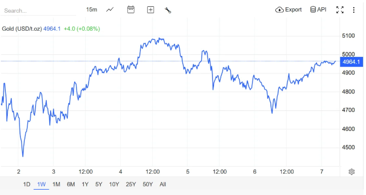 Giá vàng thế giới giao ngay chốt phiên tại thị trường Mỹ vào rạng sáng nay 7/2 (giờ Việt Nam) ở quanh mức 4.964 USD/ounce, tăng mạnh 189 USD/ounce so với chốt phiên hôm trước đó.