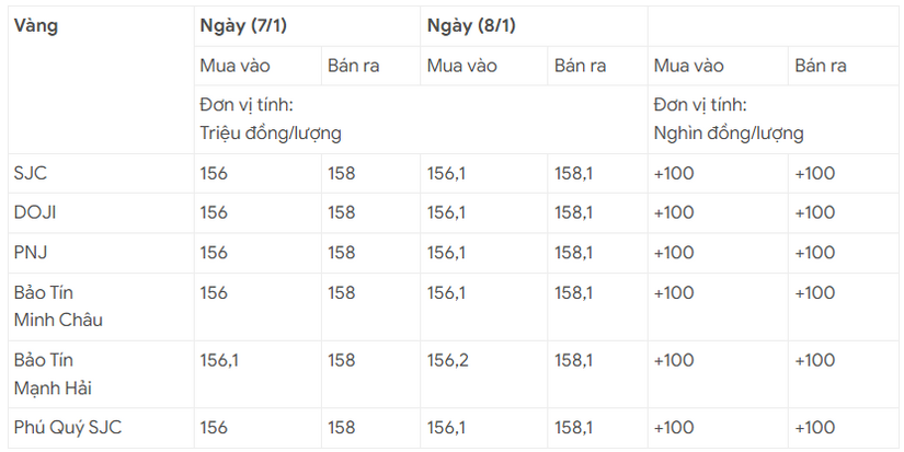 Các thương hiệu SJC, DOJI, PNJ, Bảo Tín Minh Châu, Bảo Tín Mạnh Hải, Phú Quý đồng loạt tăng so với sáng hôm qua ở cả 2 chiều, giao dịch ở mức cao nhất 156,2 triệu đồng/lượng ở chiều mua vào và đều có giá bán ra là 158,1 triệu đồng/lượng.