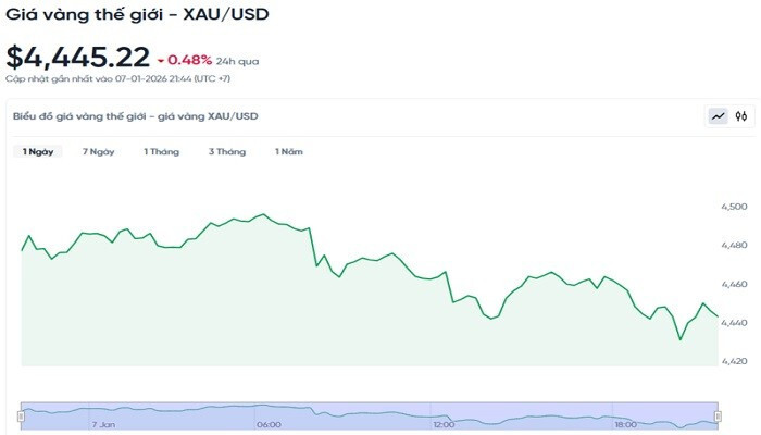 Theo Kitco, giá vàng thế giới ghi nhận lúc 4h30 hôm nay theo giờ Việt Nam giao ngay ở mức 4,445.22 USD/ounce. Giá vàng hôm nay giảm 0,48% so với hôm qua. Quy đổi theo Tỷ giá USD trên thị trường tự do (26.733 VND/USD), vàng thế giới có giá khoảng 143,2 triệu đồng/lượng (chưa tính thuế, phí). Như vậy, giá vàng miếng SJC đang cao hơn giá vàng quốc tế khoảng 15 triệu đồng/lượng.