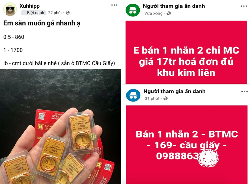 Đáng chú ý, thị trường vàng chợ đen tiếp tục sôi động dù các cửa hàng đã tăng số lượng vàng bán ra (đối với các trường hợp nhận ngay). Trên các hội nhóm Facebook, giá vàng nhẫn bán ra vẫn bị đẩy lên cao so với giá niêm yết.
