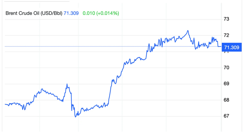 Giá dầu thô Brent ngọt nhẹ giao dịch ở mức 71,3 USD/thùng, giảm 0,43USD/thùng, tương đương mức giảm 0,61% về giá so với ngày hôm qua.