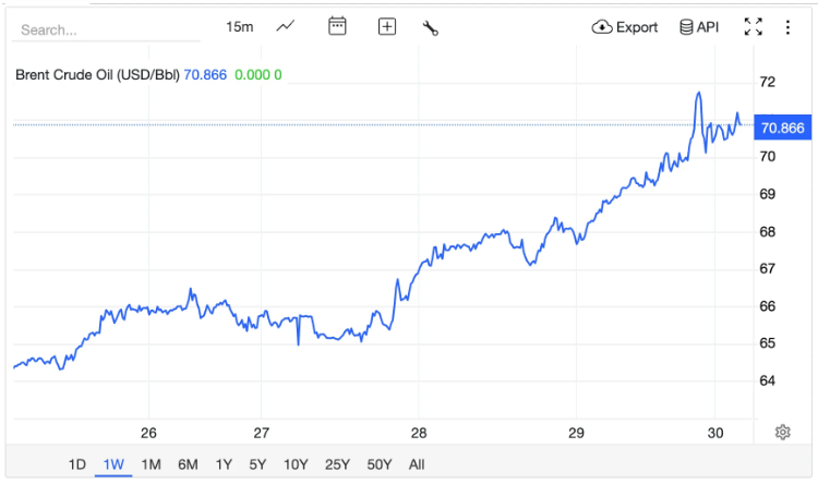 Trang Trading Economics nhận định giá dầu thô Brent giao kỳ hạn đã tăng hơn 3% lên khoảng 70,5 USD/thùng, mức cao nhất trong ngày kể từ tháng 9 và gần đạt mức đóng cửa mạnh nhất kể từ tháng 8, do phí bảo hiểm rủi ro địa chính trị tăng lên sau những lời đe dọa mới của Mỹ đối với Iran.