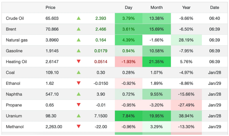 Trên thị trường giao ngay rạng sáng nay 30/1, bảng giá dầu thô trên các sàn Trading Economics và Oilprice bật tăng.