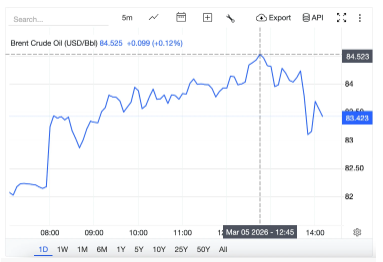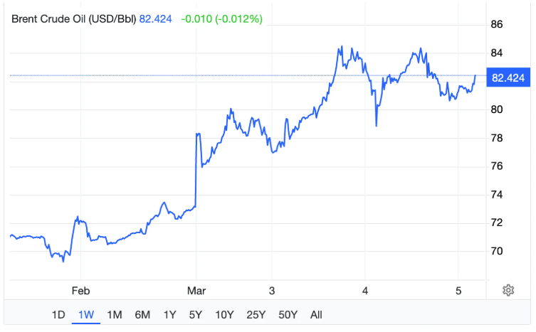 So giá trong ngày, lúc 12 giờ ngày 5/3, giá Brent tăng mạnh nhất hơn 83,5 USD/thùng, sau đó giảm nhẹ xuống mức 84 USD/thùng, 83 USD/thùng từ 13 giờ đến 14 giờ cùng ngày.Iran