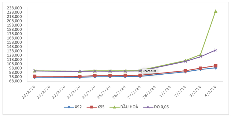 Các yếu tố nêu trên, đặc biệt là xung đột quân sự giữa Mỹ, Israel với Iran khiến giá xăng dầu thế giới trong những ngày vừa qua tăng đột biến. Giá xăng RON95 ngày 02/3/2026 ở mức 92,780 USD/thùng, tăng 10,690 USD/thùng, tương đương tăng 13,02% so với ngày 27/02/2026 (ngay trước ngày xảy ra xung đột quân sự giữa Mỹ, Israel với Iran); tương tự, dầu diesel 0,05S ngày 02/3/2026 ở mức 114,530 USD/thùng, tăng 22,270 USD/thùng, tương tăng 24,14% so với ngày 27/02/2026; dầu hỏa ngày 02/3/2026 ở mức 116,460 USD/thùng, tăng 22,890 USD/thùng, tương đương tăng 24,46%. Cá biệt, giá dầu hỏa ngày 04/3/2026 đột ngột tăng lên mức 231,420 USD/thùng, tăng 101,190 USD/thùng, tương đương tăng 77,70% so với ngày trước liền kề, 03/3/2026.