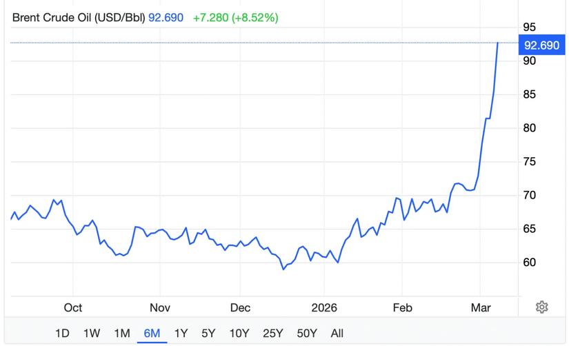 Trading Economics cho thấy, giá dầu Brent trong phiên ngày 7/3 đã tăng lên hơn 93,43 USD/thùng, tái lập vùng đỉnh cao nhất từng ghi nhận vào tháng 11/2023. Trong suốt giai đoạn 2024 - 2025, thị trường dầu thô chưa từng chứng kiến đợt tăng giá mạnh và nhanh như thời điểm hiện tại.