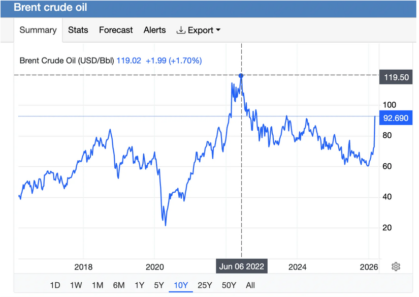 10 năm gần đây, thế giới chứng kiến hơn 4 lần giá dầu thô Brent tăng sốc, trong đó đều liên quan đến chiến sự như Nga - Ukraine, hoặc tình hình xung đột Trung Đông giữa Mỹ và Iran (Ảnh: Trading Economics).