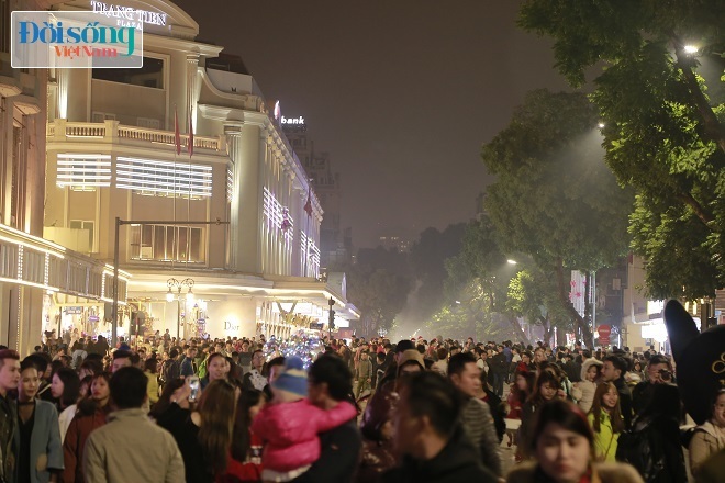 Lượng người đổ ra đường đi chơi Noel sớm rất đông, khoảng 19h tại phố đi bộ Hồ Gươm chật kín chỗ đứng.