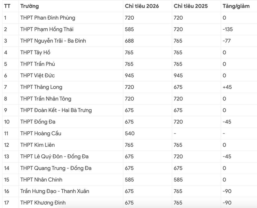 Theo thống kê, có 30 trường THPT tăng chỉ tiêu từ 45-90 học sinh, hơn 20 trường THPT bị giảm, các trường còn lại chỉ tiêu ổn định như năm 2025.