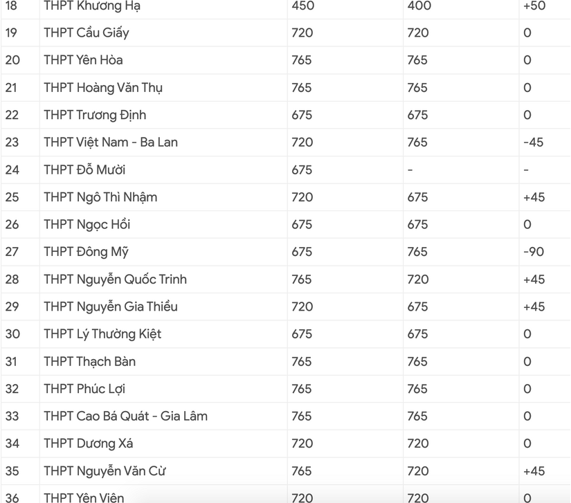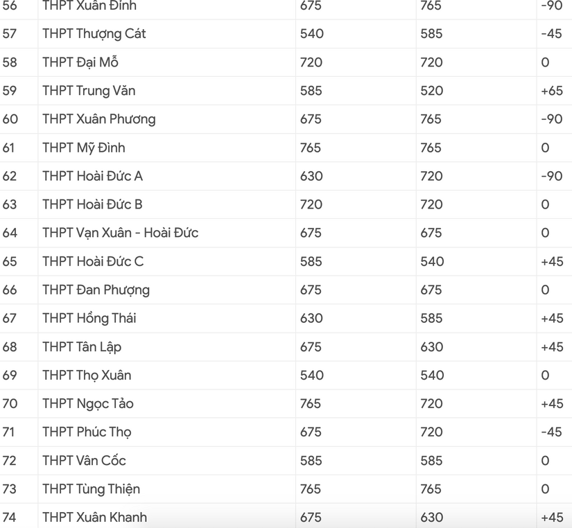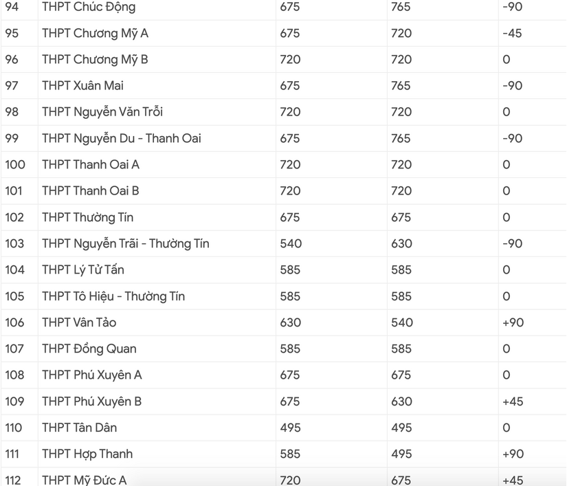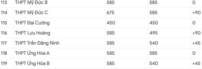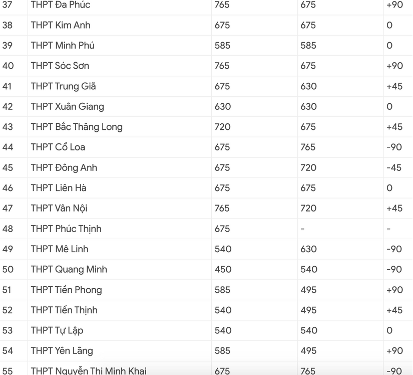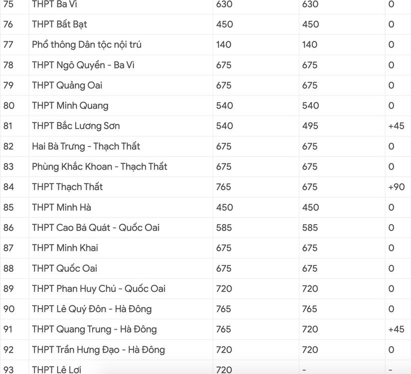 Trường THPT chất lượng cao Phan Huy Chú - Đống Đa tuyển 400 chỉ tiêu. Ba trường hiện vẫn chưa được giao chỉ tiêu dù đang trong quá trình hoàn thiện về cơ sở vật chất gồm: Trường THPT Hoàng Quán Chi - phường Yên Hòa, Trường THPT Vĩnh Hưng - phường Vĩnh Hưng, Trường THPT Việt Hùng - xã Đông Anh.