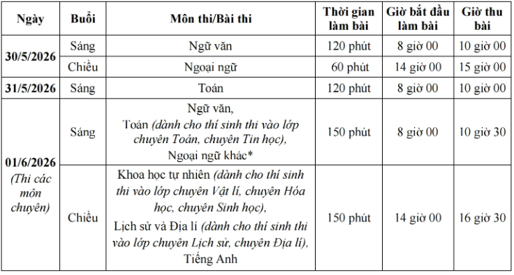 Lịch thi vào lớp 10 Hà Nội 2026