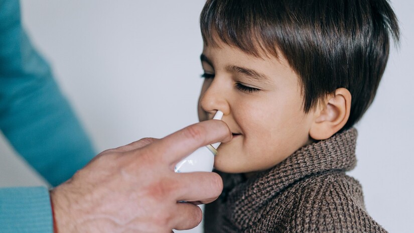 - Đưa nhẹ nhàng đầu vòi xịt vào lỗ mũi phía trên (ví dụ, nếu trẻ nằm nghiêng bên trái, hãy xịt vào lỗ mũi bên phải).