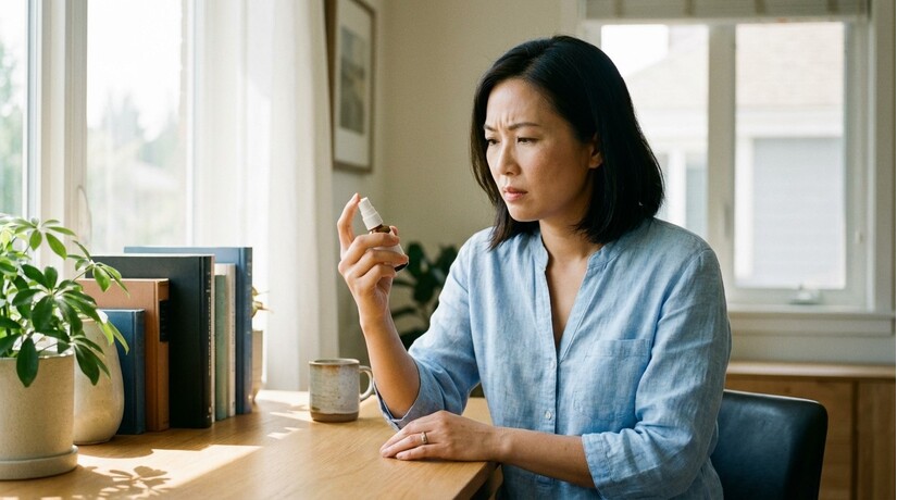 Người phụ nữ đang đọc kỹ hướng dẫn sử dụng sản phẩm xịt họng để hiểu rõ công dụng và thành phần