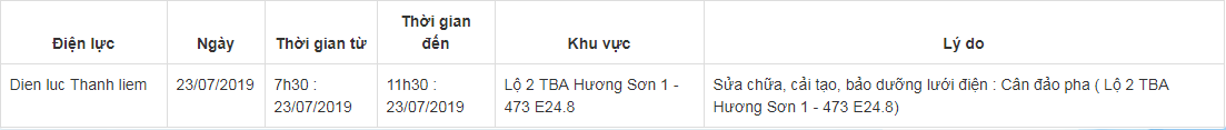 Cụ thể, Điện lực Hà Nam thông báo lịch tạm ngừng cung cấp điện (lịch cúp điện Hà Nam) từ ngày 20/7 đến ngày 27/7 như sau: