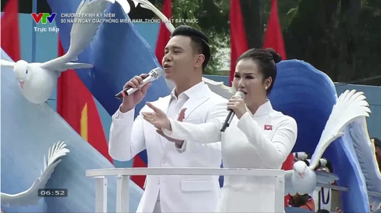 Ca sĩ Võ Hạ Trâm và Đông Hùng thể hiện tác phẩm "Viết tiếp câu chuyện hòa bình" tại chương trình nghệ thuật Rạng rỡ non sông Việt Nam chào mừng 50 năm Ngày Giải phóng miền Nam, thống nhất đất nước sáng 30/4. (Ảnh: VTV)