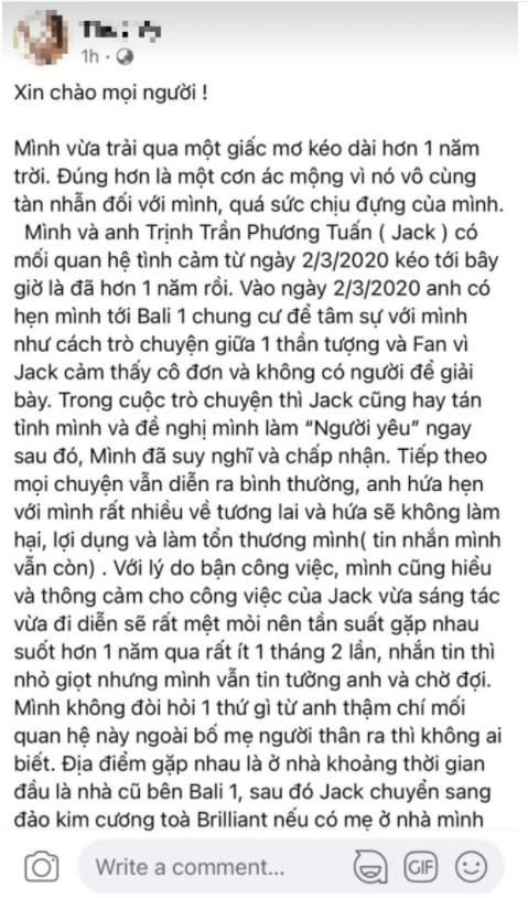 Bài đăng của cô gái tên T.V tố Jack bắt cá 2 tay, có con với hot girl Thiên An
