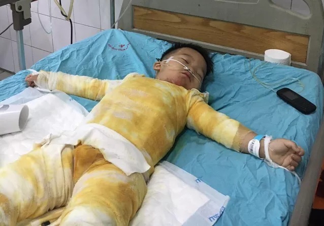 Bé Hải bị bỏng nặng khi không may bị ngã vào nồi canh nóng. Ảnh GD