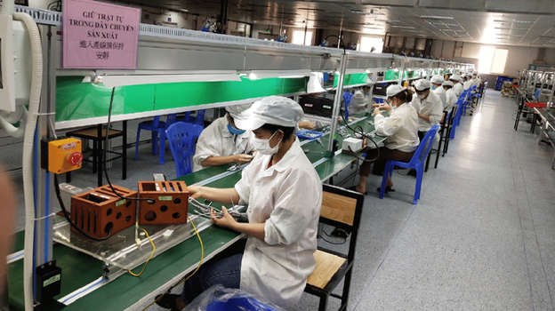 Xưởng sản xuất của Công ty TNHH New Wing Interconnect Technology (Khu công nghiệp Vân Trung, huyện Việt Yên, tỉnh Bắc Giang) bảo đảm giãn cách giữa người lao động theo quy định. Ảnh: Minh Linh.