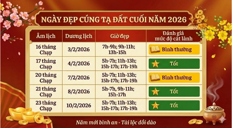 Tính từ sau Rằm tháng Chạp năm Ất Tỵ 2025 đến lễ tiễn Công ông Táo về chầu trời, có 5 ngày dưới đây phù hợp cho việc tiến hành cúng tạ đất cuối năm. Cụ thể về từng ngày tốt, khung giờ đẹp như sau: