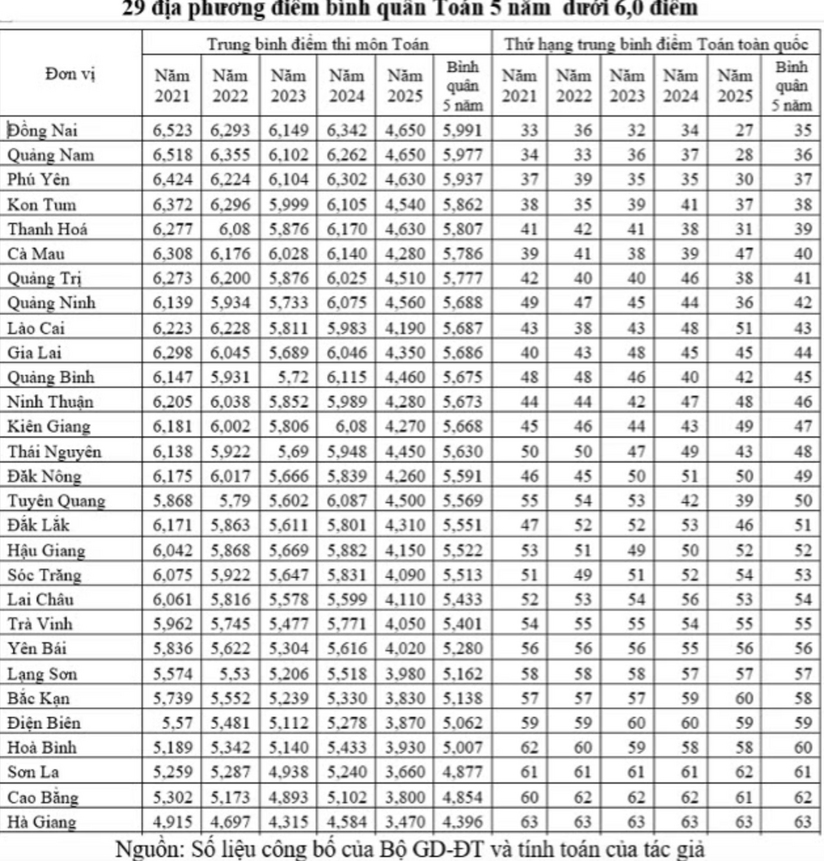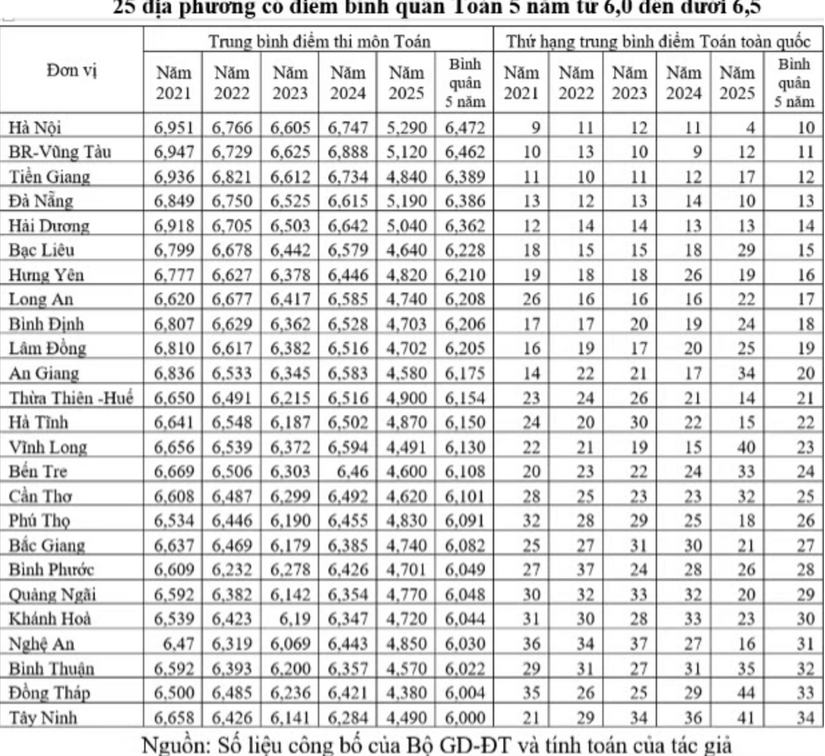 Kết quả đối sánh 63 tỉnh, thành phố (trước khi sáp nhập) cho thấy chất lượng môn Toán phân hóa vùng miền rất rõ. Các địa phương có truyền thống giáo dục mạnh như Nam Định, Bình Dương, TP.HCM, Hà Nội, Bắc Ninh, Hải Phòng… thường xuyên nằm trong nhóm dẫn đầu, trong khi nhiều tỉnh miền núi, vùng khó khăn chủ yếu ở nhóm cuối. Riêng năm 2025, chỉ có 11 địa phương đạt điểm trung bình trên 5 (17,5%), còn lại 52 địa phương dưới 5 điểm, trong đó có 7 địa phương dưới 4,0 điểm. Đối sánh theo điểm bình quân 5 năm cho thấy các địa phương có thể chia thành ba nhóm: Từ 6,5 điểm trở lên; từ 6,0 đến dưới 6,5; và dưới 6,0 điểm.