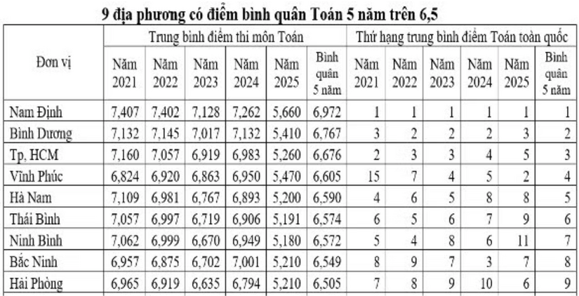Các địa phương này thường xuyên góp mặt trong top 10 giai đoạn 2021–2025. Điều đó cho thấy, kết quả môn Toán không thể là thành quả ngắn hạn, mà là sự kết tinh của một quá trình đầu tư bền bỉ, từ giải pháp chuyên môn, chất lượng đội ngũ giáo viên đến cách tổ chức dạy học ở cả bậc THCS và THPT.