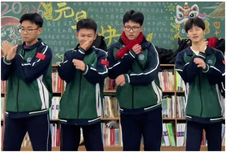 Những cậu học trò đi học muộn trình diễn trên bục giảng, trong khi các bạn phía dưới háo hức dõi theo. Ảnh: Douyin