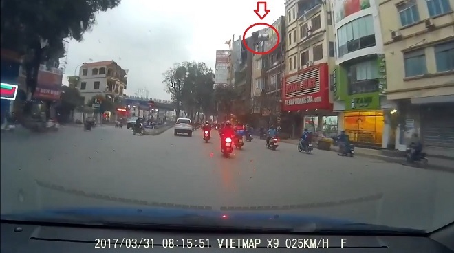 Sự việc chiếc bồn đựng nước rơi từ tầng 5 xuống mặt đất diễn ra vào lúc 8h20 phút ngày 31/3 gần Ngã tư sở do camera hành trình từ chiếc oto đi đường ghi lại được khiến nhiều người "sợ tái mặt".