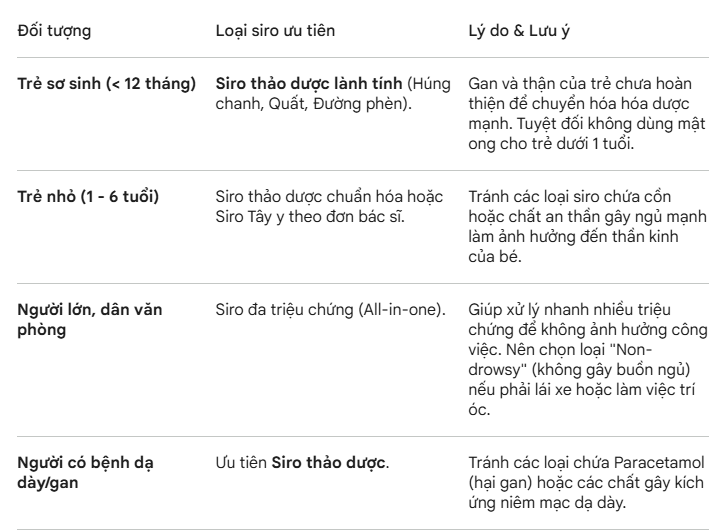 Việc lựa chọn đúng loại siro cảm không chỉ giúp bệnh nhanh khỏi mà còn bảo vệ gan, thận và hệ hô hấp khỏi những tác dụng phụ không đáng có. Để biết "khi nào nên dùng loại nào", chúng ta cần phân tích dựa trên triệu chứng chủ đạo và đối tượng sử dụng.