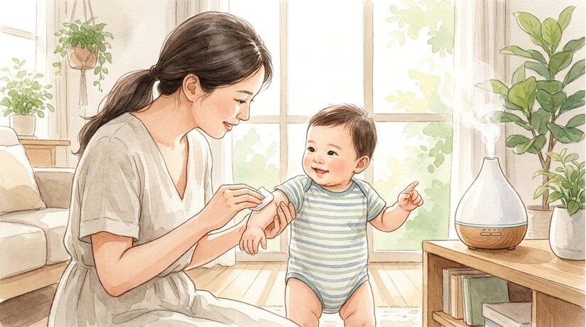 Người mẹ đang thoa tinh dầu pha loãng lên tay em bé, minh họa cách dùng tinh dầu sả an toàn