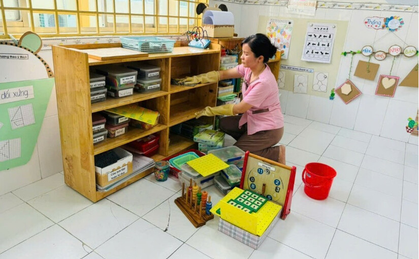 Vệ sinh, khử khuẩn khu vực đựng đồ dùng học tập phòng chống dịch bệnh tại một trường mầm non tại TPHCM. (Ảnh: HCDC).