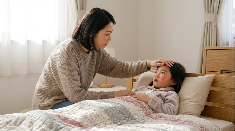 Người mẹ ân cần chăm sóc con đang bị sốt, thể hiện sự lo lắng và quan tâm