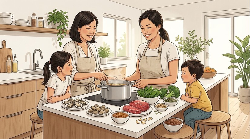 Người mẹ đang chuẩn bị bữa ăn giàu kẽm, thể hiện cách bổ sung kẽm qua thực phẩm hàng ngày