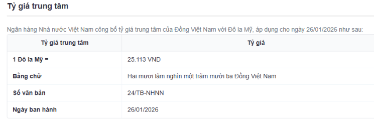 Tỷ giá trung tâm sáng nay được Ngân hàng Nhà nước niêm yết ở mức 25.113 VND/USD, giảm 12 đồng so với phiên cuối tuần trước.