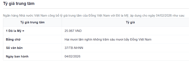 Tỷ giá trung tâm sáng nay được Ngân hàng Nhà nước niêm yết ở mức 25.067 VND/USD, giảm 2 đồng so với phiên liền kề.