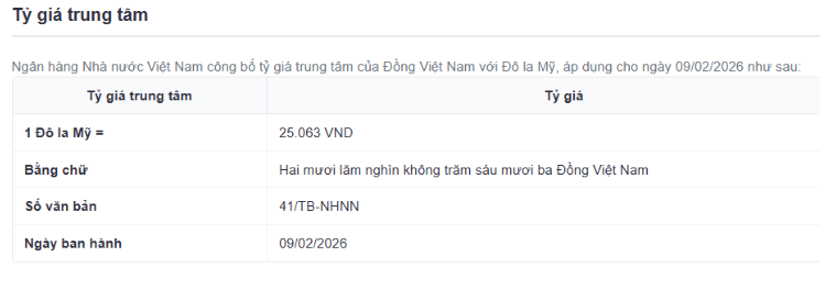 Tỷ giá trung tâm sáng nay được Ngân hàng Nhà nước niêm yết ở mức 25.063 VND/USD, giảm 2 đồng so với chốt phiên tuần qua.