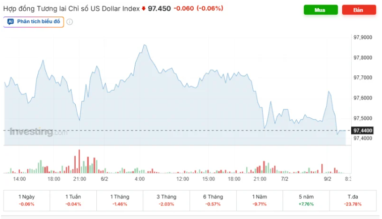 Trên thế giới, chỉ số USD Index - thước đo sức mạnh của USD so với 6 đồng tiền chủ chốt (EUR, JPY, GBP, CAD, SEK, CHF) mở đầu tuần ở mức 97,45 điểm.