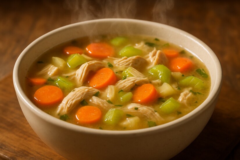 - Tối: Súp gà xé nấu với ngô và nấm hương.