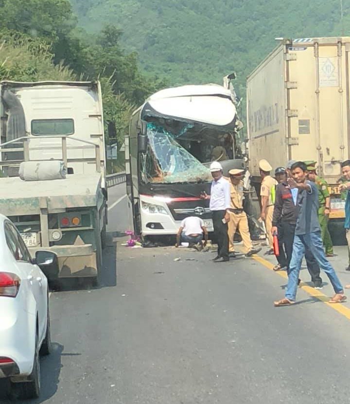 Tại hiện trường, chiếc xe khách bị nát bét phần đầu, nhiều mảnh vỡ văng tung toé. Vụ tai nạn giao thông khiến đường dẫn phía nam hầm Hải Vân ùn ứ nghiêm trọng.