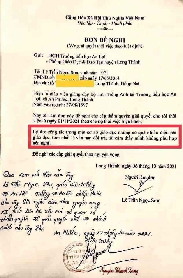 Thầy Sơn viết đơn đề nghị các cấp có thẩm quyền giải quyết cho thôi việc từ ngày 1/11/2021 theo chế độ thôi việc hiện hành với lý do: "Công tác trong một cơ sở giáo dục nhưng có quá nhiều điều phi giáo dục, nhất là vấn nạn dối trá, tôi cảm thấy mình không phù hợp nên nghỉ".